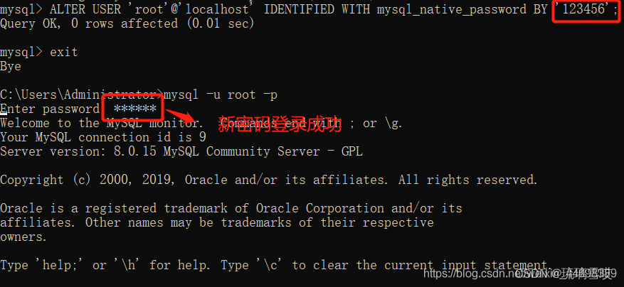 (4)修改密码,输入 ALTER USER ‘root’@‘localhost’ IDENTIFIED WITH mysql_native_password BY ‘新密码’;