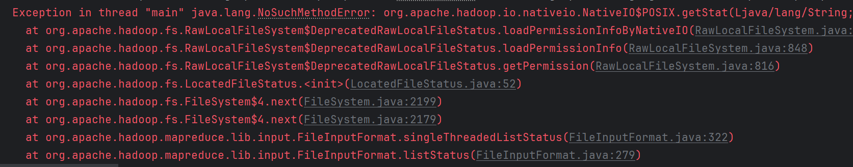 在运行本地大hadoop应用程序时报错如下 按照网络教程检查了hadoop和java路径都是正确的。 问题出在程序的数据输入路径,不可以只到文件夹(第一张截图),必须指定数据文件的名字或者以*表示目录下所有的文件(第二张截图),否则就会报错。