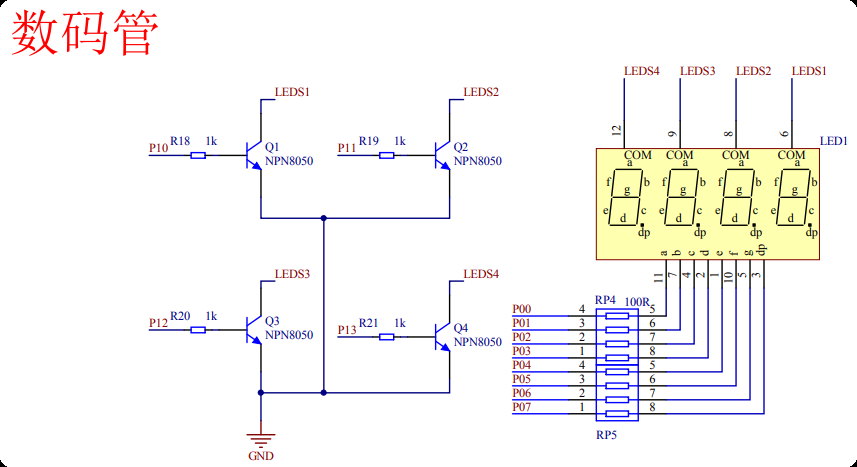 注:共阴极,在三极管中,将P10置一,LEDS1即为0被选中;