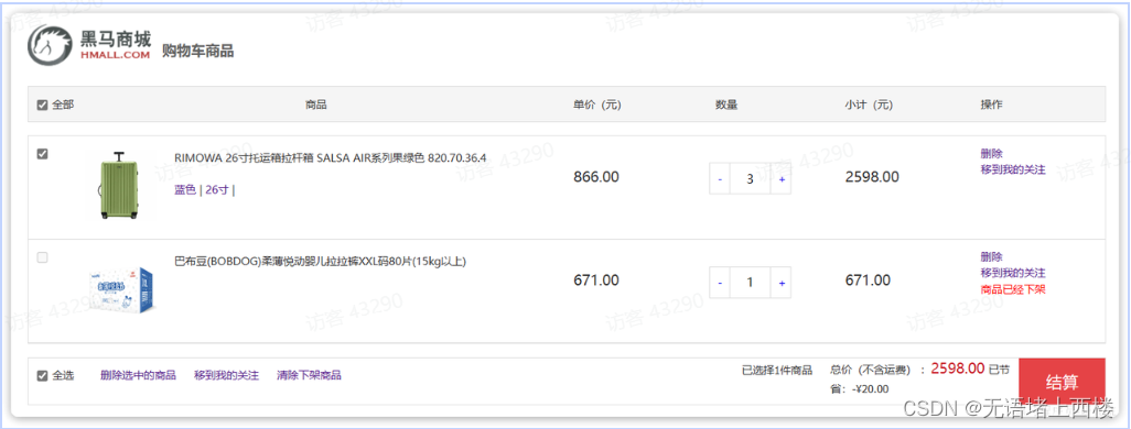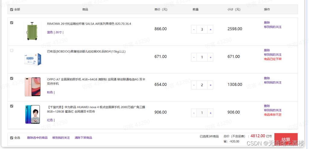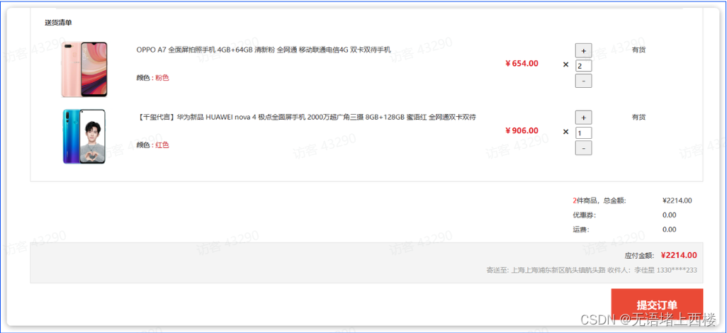 目前有4个购物车,然结算下单,进入订单结算页面:
