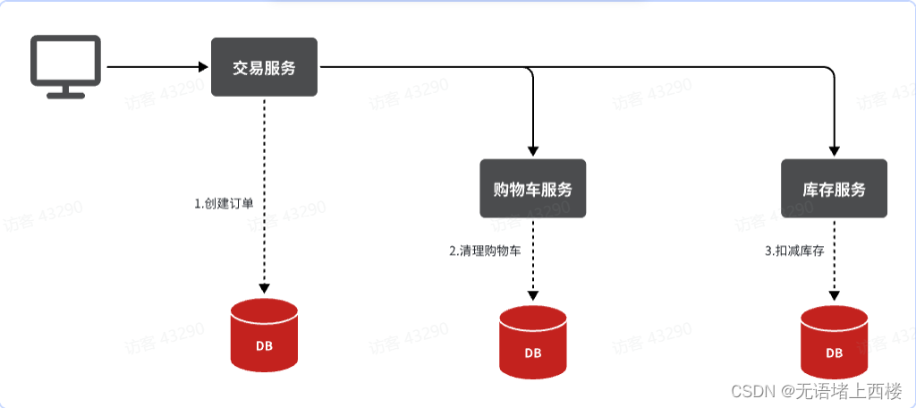 由于订单、购物车、商品分别在三个不同的微服务,而每个微服务都有自己独立的数据库,因此下单过程中就会跨多个数据库完成业务。而每个微服务都会执行自己的本地事务: