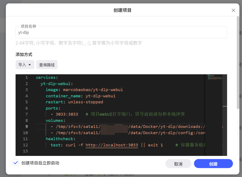🔺在新增项目页面自定义项目名称,输入以下 Docker Compose 配置信息后点“创建”按钮: