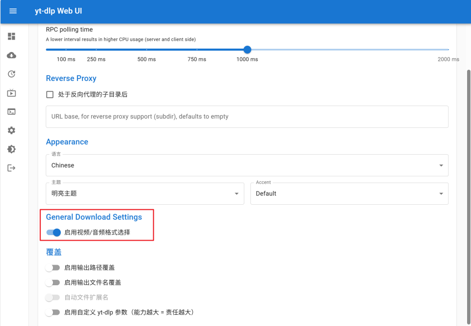 🔺在设置里面其实还有很多个性化的选择,比如设置界面主题,启用格式选择,路径覆盖,文件名覆盖等。我这里演示开启视频/音频格式选择。