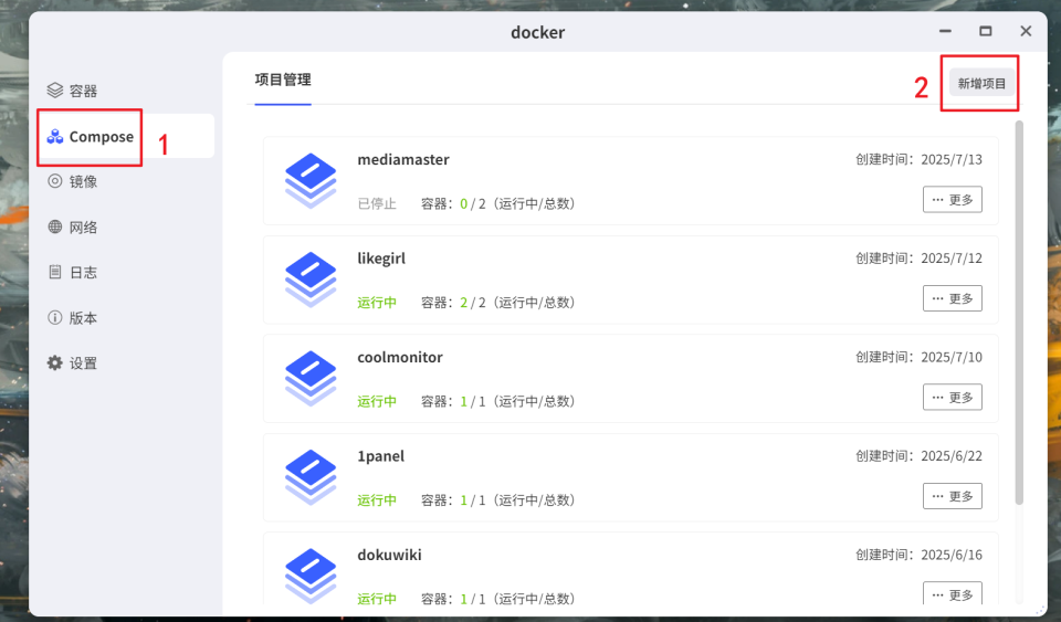 🔺然后打开极空间NAS的“Docker”应用,点击【Compose】 > 【新增项目】。