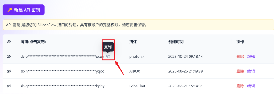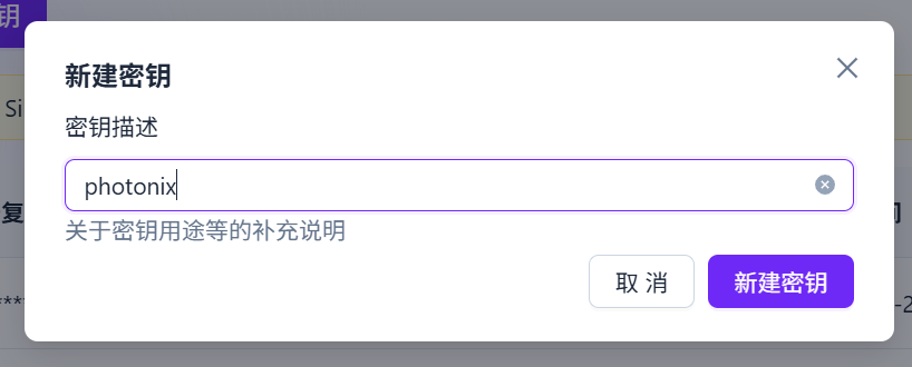 🔺随意为该秘钥添加一个描述(命名),比如我这里是为了在LobeChat上使用,所以就描述为“photonix”。