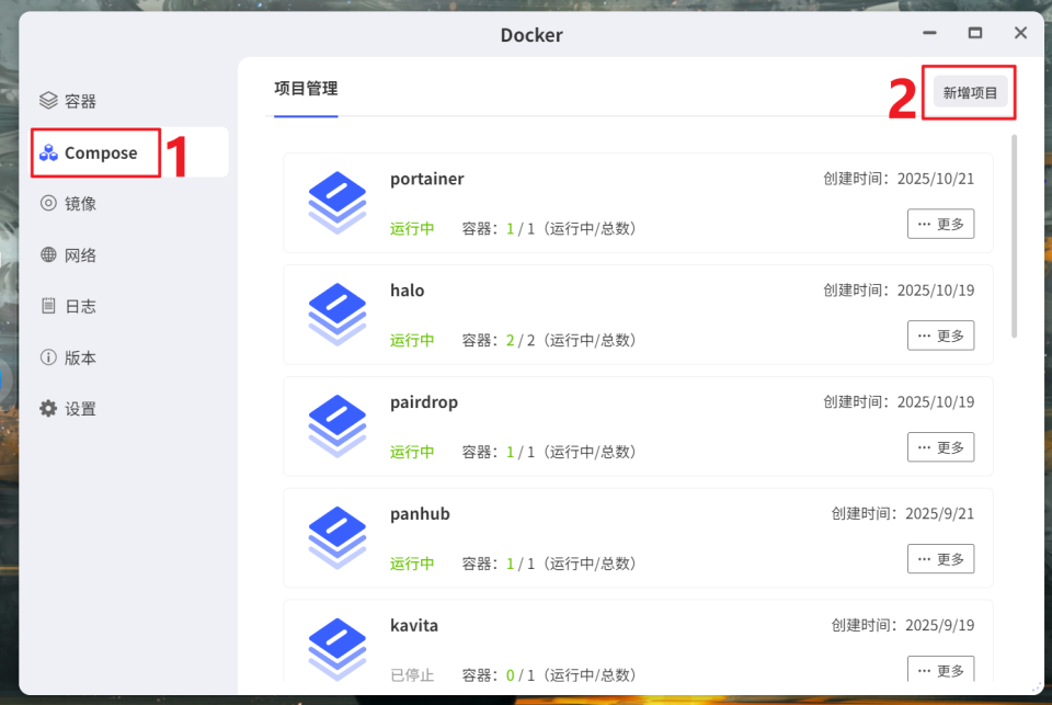 🔺接着打开极空间NAS的“Docker”应用,点击【Compose】 > 【新增项目】。