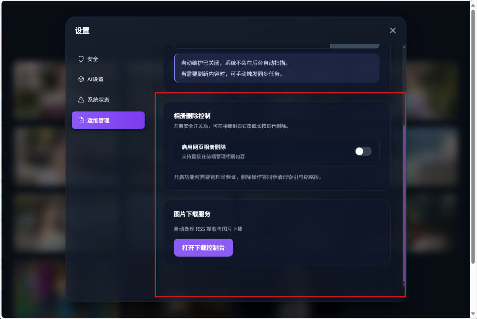 🔺最后是设置里面的“运维管理”,涉及到相册的删除控制与下载服务,不过需要输入管理员密码,就是我们部署时候设置的超级管理员密钥。