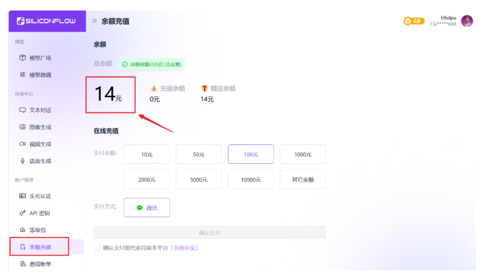 🔺注册完毕后进入后台,在【余额充值】就能看到赠送的14元余额,约等于2000万Tokens,这也足够我们使用很长一段时间了。