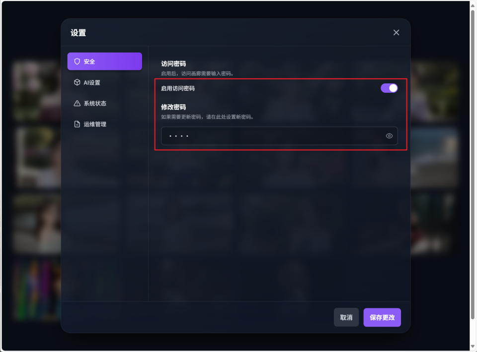 🔺接着来看它的设置界面。首先是安全方面,这里可以设置一个访问密码。