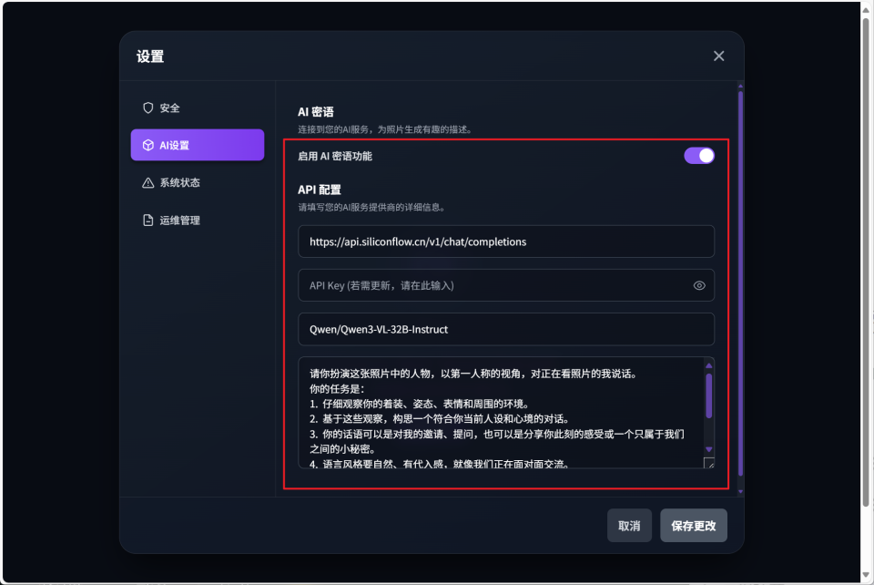 🔺然后是它的核心功能--AI密语,不过这里需要我们提前准备好具有视觉识别的大模型,并且还能自定义提示词。啥?你没有?嗯嗯,我文章最后已经为大家准备了一个不花钱的方案。