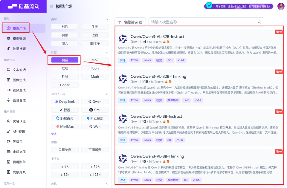 🔺最后我们就可以任意调用想要的模型了。比如说本文内容需要的视觉模型,直接在主页的“模型广场”选择‘视觉“,后面就有很多视觉模型可以直接使用,随意选中 一个就可以了,是不是很Nice~
