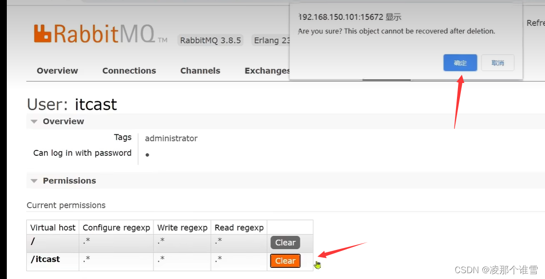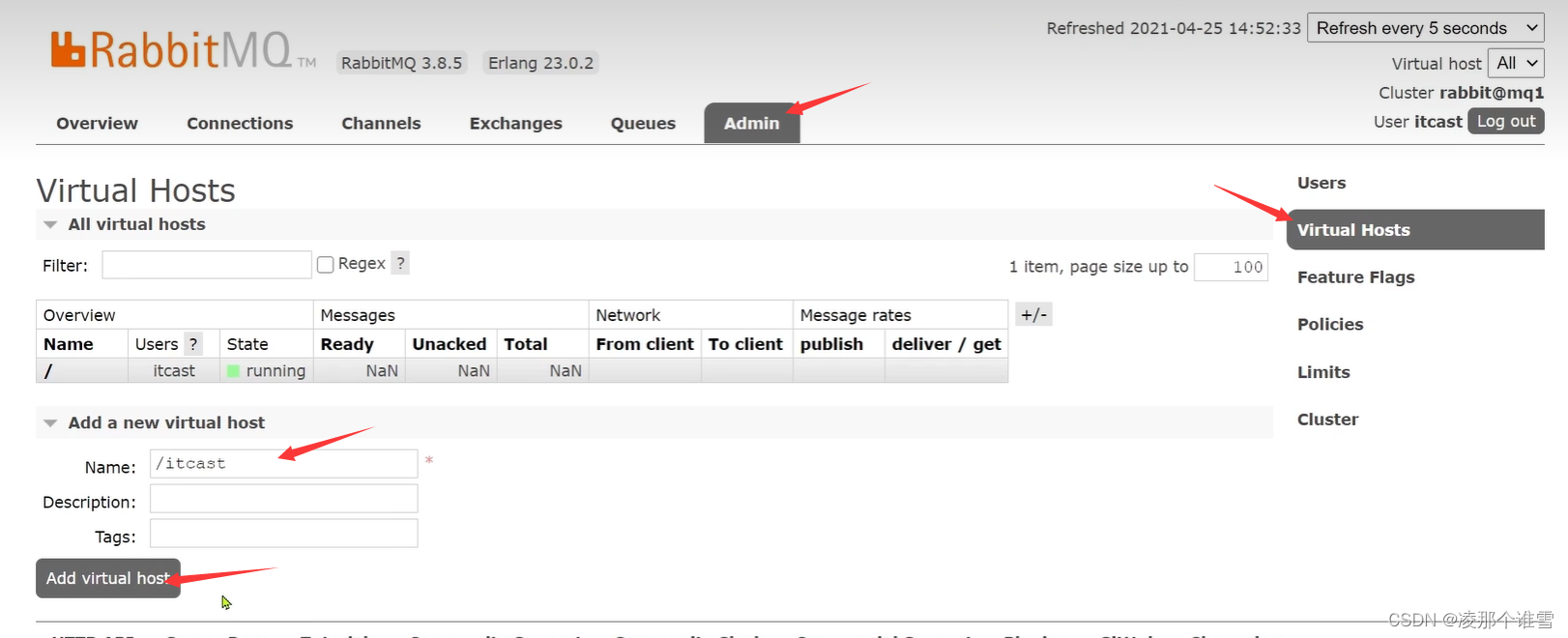 创建新的虚拟主机,name为/itcast,最后点击add virtual host
