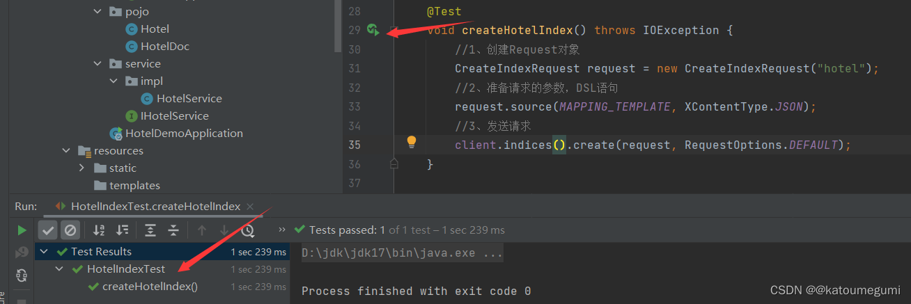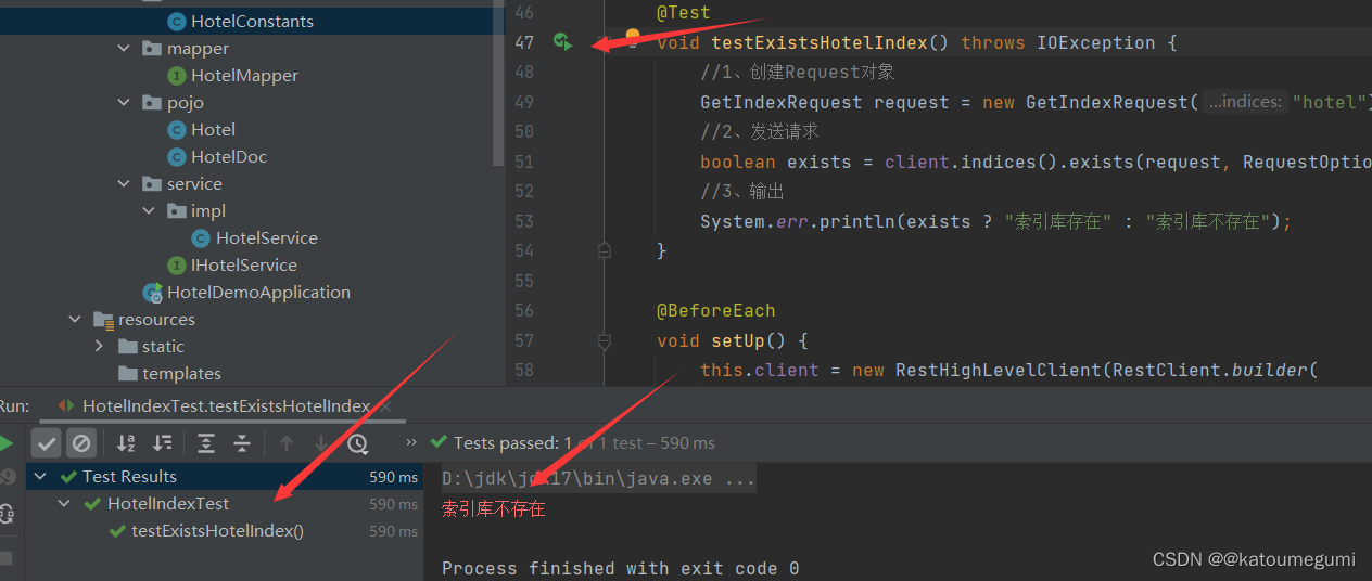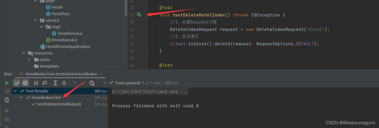 4、发送请求。调用RestHighLevelClient#tindices().xxx()方法,xxx是create、exists、delete