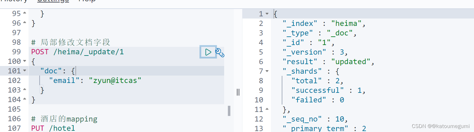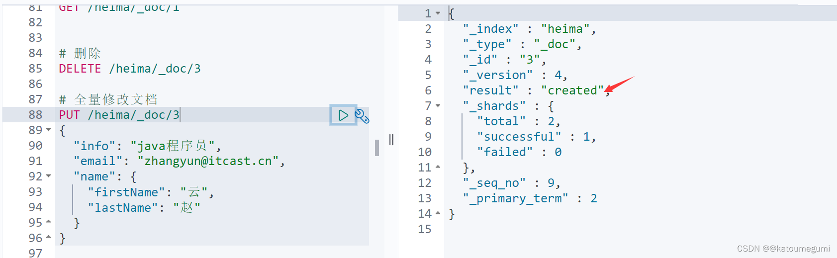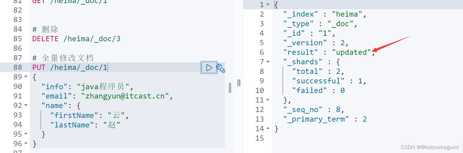 全量修改:PUT/索引库名/_doc/文档id { json文档}