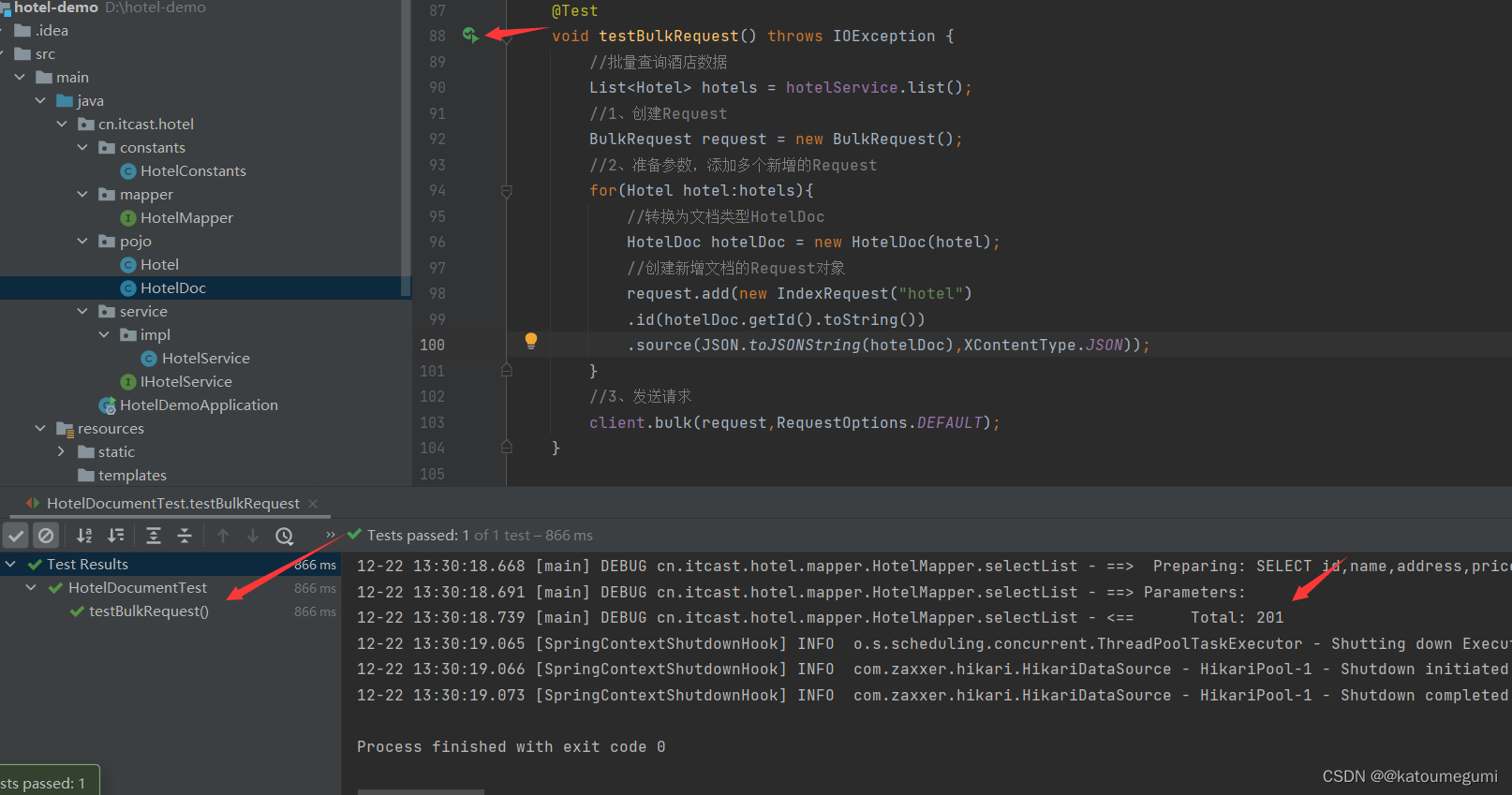 运行该测试,控制台运行成功,并且可以看到导入了201条数据,正好表的数据量