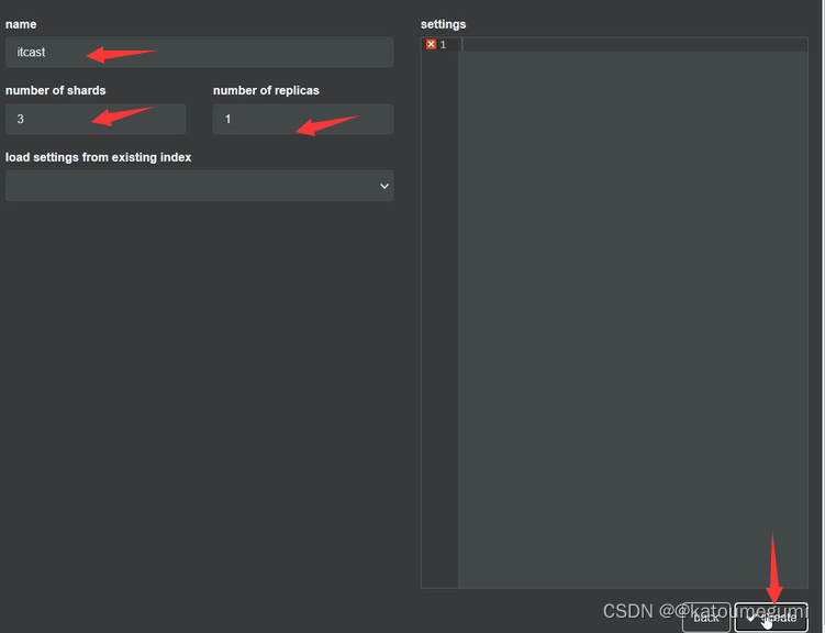 name是索引库名字,number of shards是几个片,number of replicas是几个备份。最后点create创建