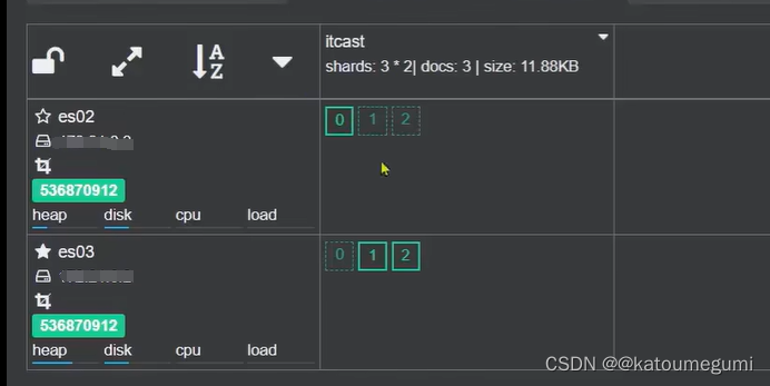回到主页,可以看到每个片都有两个,因为每个片都有一个,而且我设置了一个备份,所以每个片有两个。实线框是主分片,虚线框是副本分片。