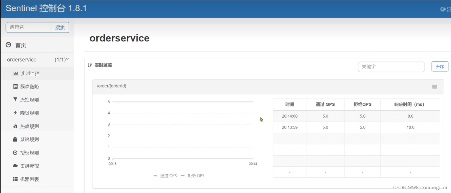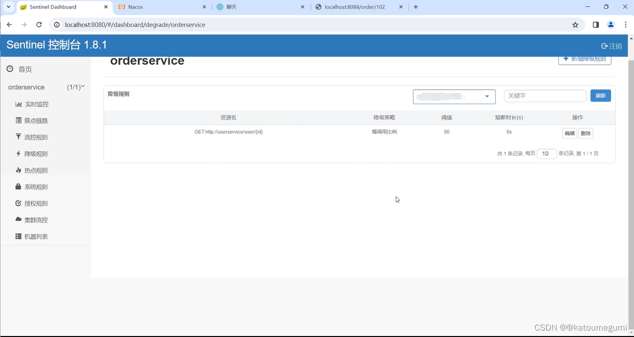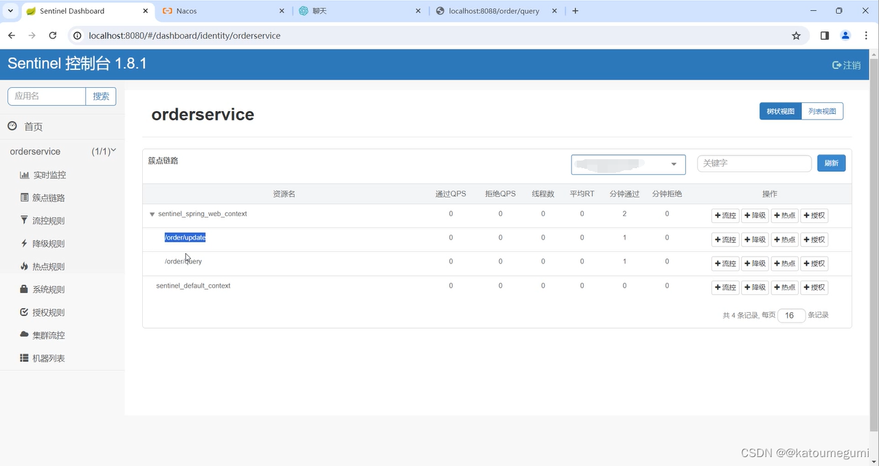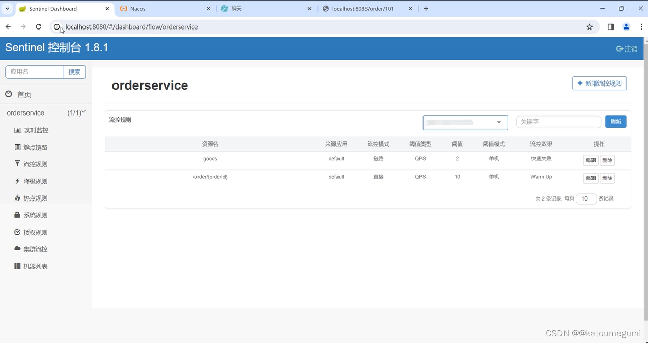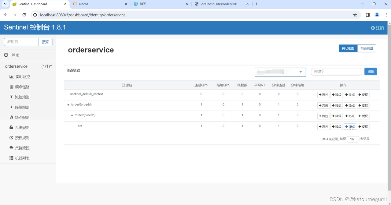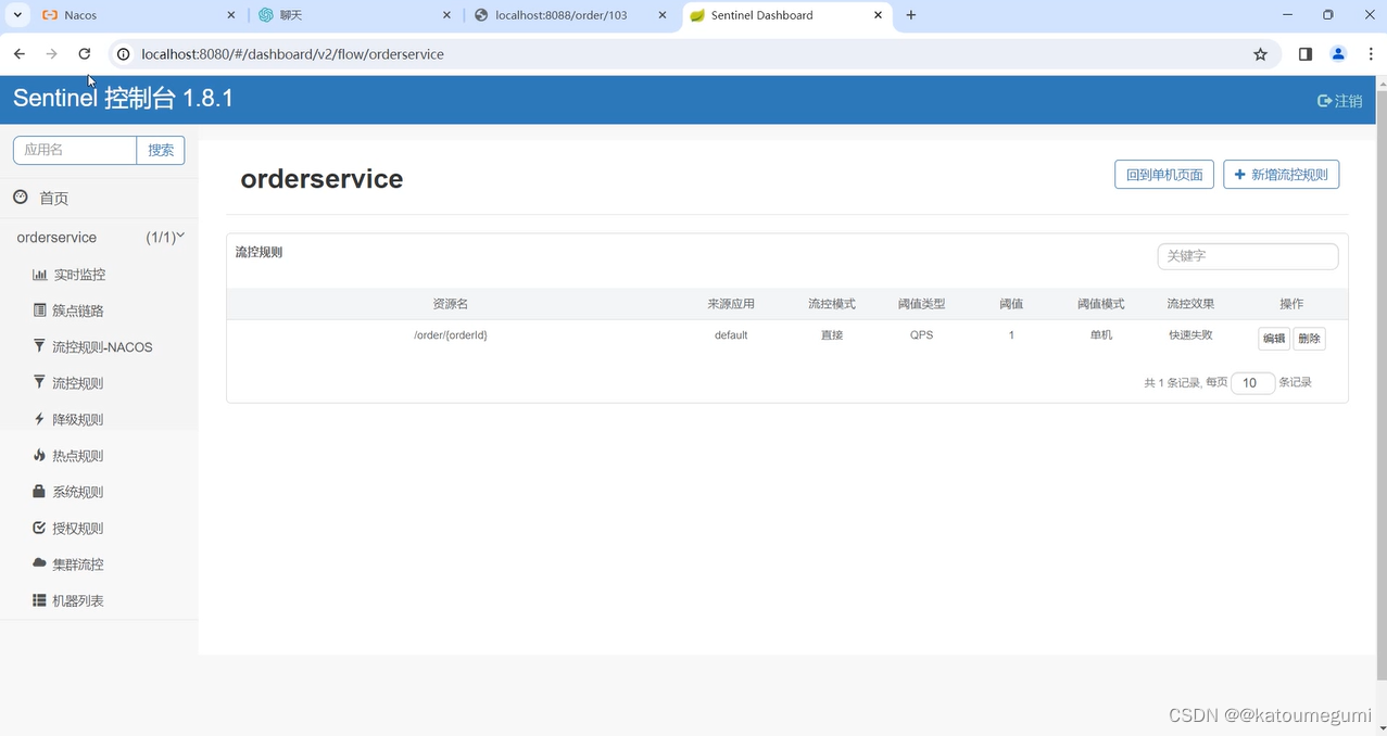 访问loaclhost:8848,进入nacos,访问localhost:8088/order/103, 刷新sentinel控制台,可以看到新的列表