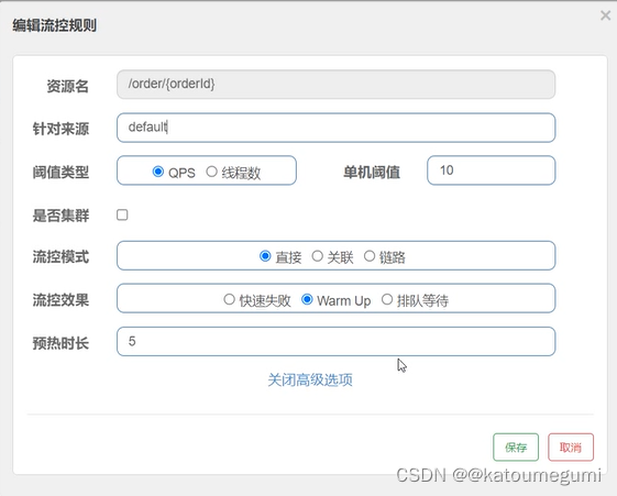 2、warm up:QPS超过阈值时,拒绝新的请求;QPS阈值是逐渐提升的,可以避免冷启动时高并发导致服务宕机。