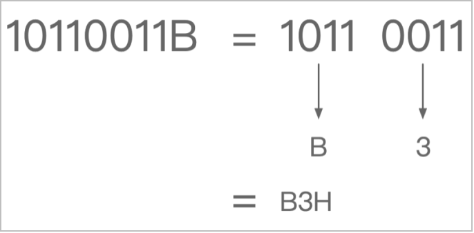 - 二进制转十六进制:采用四合一法,即从二进制的小数点为分界点,向左(或向右)每四位对应十六进制的一位,不足四位的前面补0,例如:10110011B = 1011 0011 = B3H