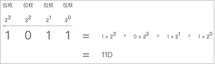 - 二进制转十进制:采用位置计数法,其位权是以2为底的幂,顺序从右到左,从0开始计数。例如二进制数1011B = 1 * 23 + 0 * 22 + 1 * 21 + 1 * 20 = 11D