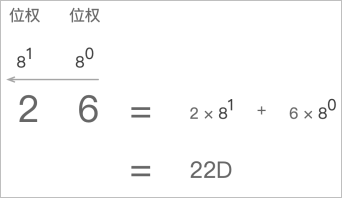 - 八进制转十进制:和二进制转十进制的方法一样,采用位置计数法,其位权是以8为底的幂,顺序从右到左,从0开始计数。例如八进制数26(八进制) = 2 * 81 + 6 * 80 = 22D