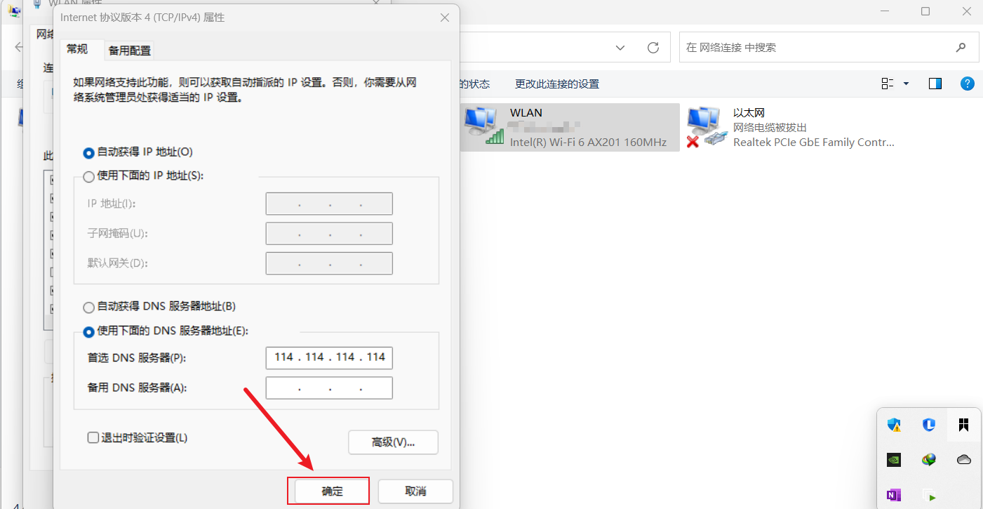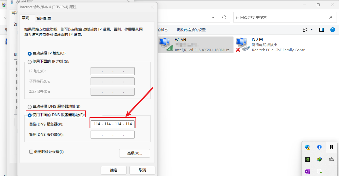 7.选中【使用下面的DNS...】,【首选DNS服务器】输入114.114.114.114(谷歌可输入8.8.8.8)。