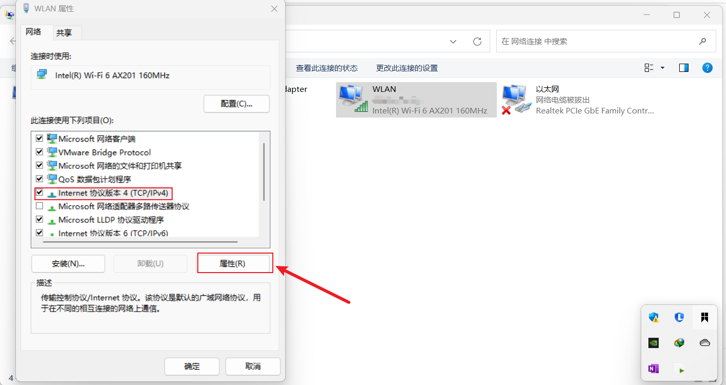 6.找到【Internet协议版本4(tcp/ipv4)】,单击【属性】。