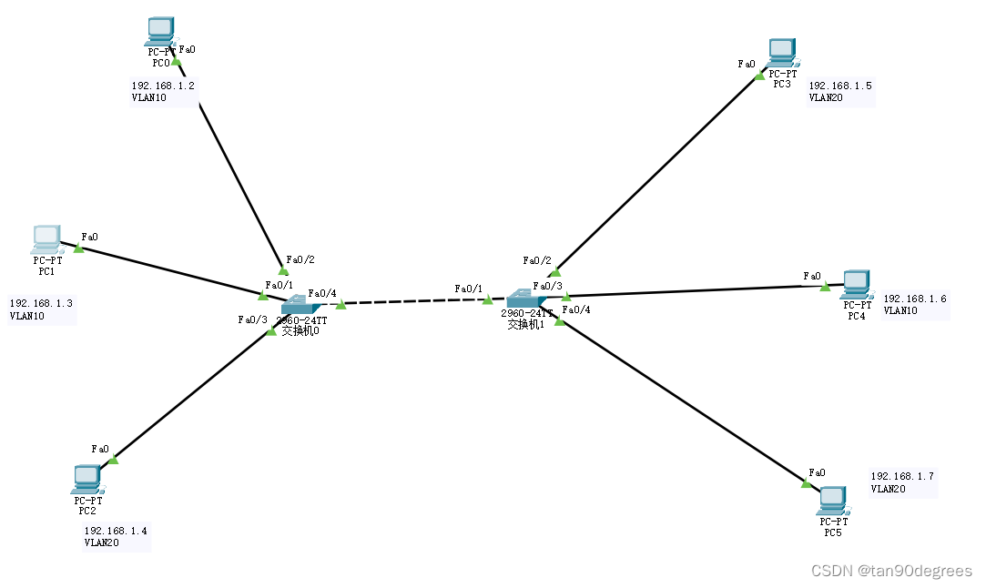 实验三 交换机VLAN配置实验 配置VLAN(Virtual Local Area Network,虚拟局域网)可以在一个物理网络基础上创建多个虚拟网络,从而实现以下作用:1.分割广播域:广播是在局域网中广播数据包以便与其他设备通信的一种机制。当局域网中设备众多时,广播会导致网络拥塞和性能下降。通过配置VLAN,可以将物理网络划分为多个虚拟网络,每个VLAN形成一个独立的广播域,从而限制广播流量在VLAN内传播,减少广播对整个网络的影响。