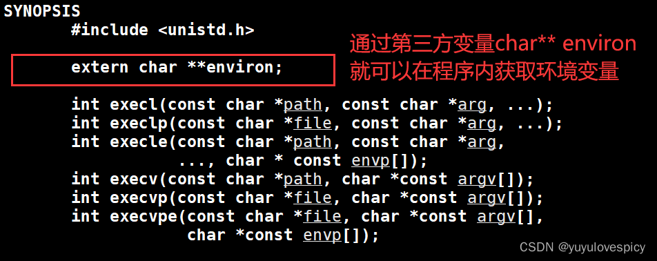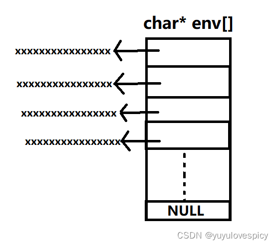 这个environ的类型是一个二级指针char**,事实上,environ所指向的元素是一个个char*的字符串指针,char** environ的结构从某种程度上来说和char* env[]是非常像的。