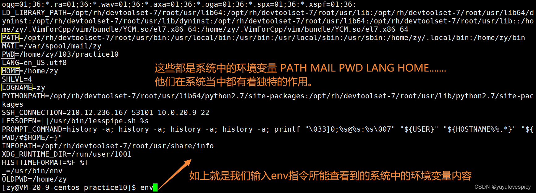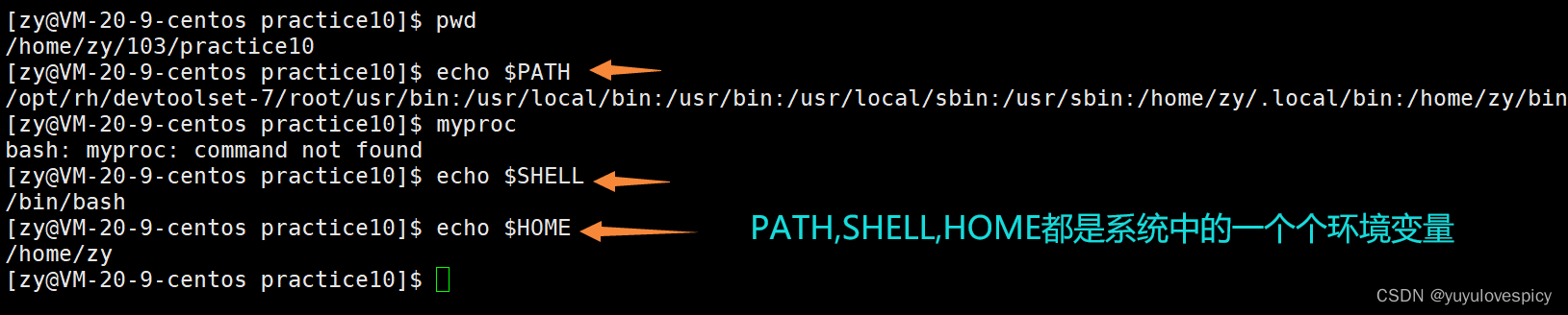 在系统当中,环境变量其实不止一个PATH,还有HOME,SHELL等等环境变量。比如HOME就是表明了当前用户的工作目录(/home/zy/),SHELL就表明当前使用的shell外壳,即所使用的命令行解释器(bash)。