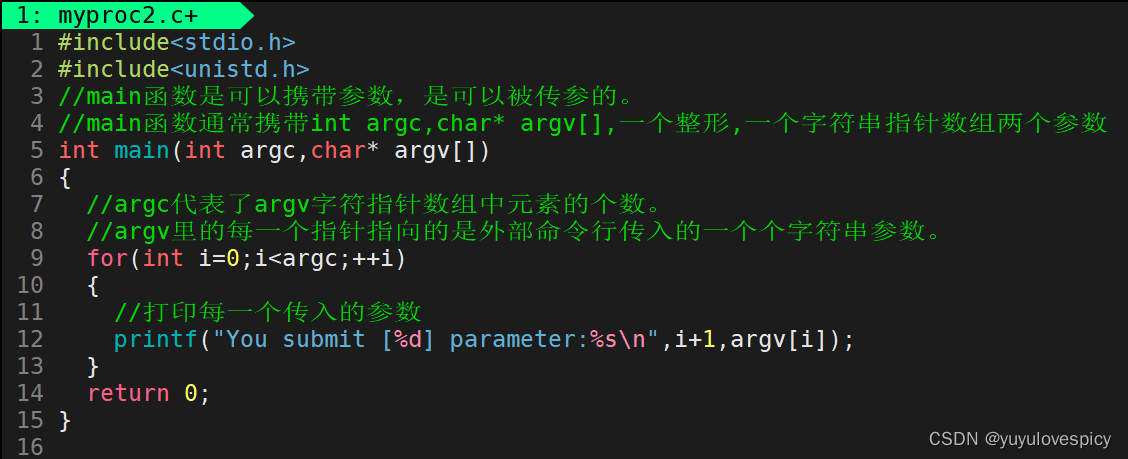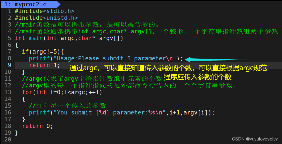 如果你什么都不带,那只会传进去 ./myproc 这个字符串(指针)。所有的字符串,都会无一例外被传入!! 以空格作为分隔符,都被看作字符串传入到进程当中。所以我们有一个字符串指针数组结构的argv参数,里面存储的就是传入的字符串参数,里面有argc个有效字符串(指针)。
