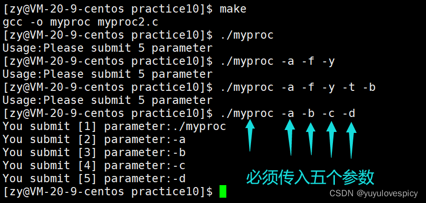 而且我们这个可执行程序,需要限制你传入参数的个数,可以直接通过argc知道你传入的字符串参数的个数,比如就可以立即知道:你传入了argc个字符串,你传入了 argc-1 个选项。例如你必须让传入5个字符串参数(必须传入4个选项):