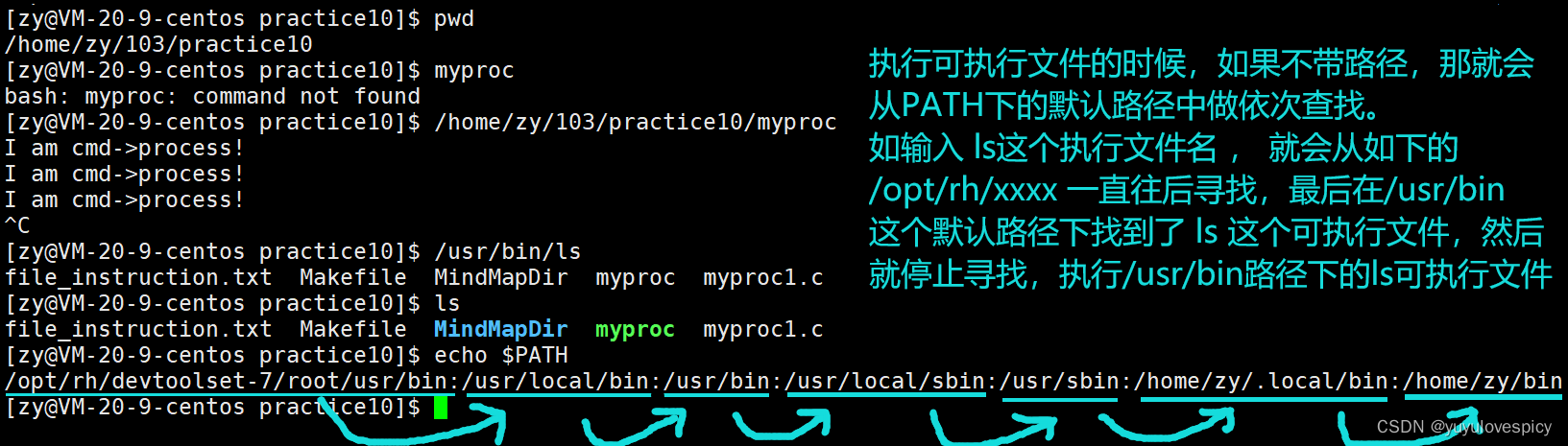 知道这两个概念后,我们就会产生一个疑问,那就是为什么我们执行gcc , ls这些系统级别的指令,工具(可执行文件)的时候,却不用带路径,可以直接找到这个文件,如我们ls这个可执行文件是存储在/usr/bin里面的,应该用 /usr/bin/ls来执行,但是不加寻址/usr/bin,而直接ls就可找到执行。不过我们自己写的编译出的可执行文件如myproc,a.out等,就必须带路径,如 ./myproc ,/home/zy/103/practice10/myproc ,才可以找到这个文件,只输入可执行文件名myproc,就无法执行了,command not found。