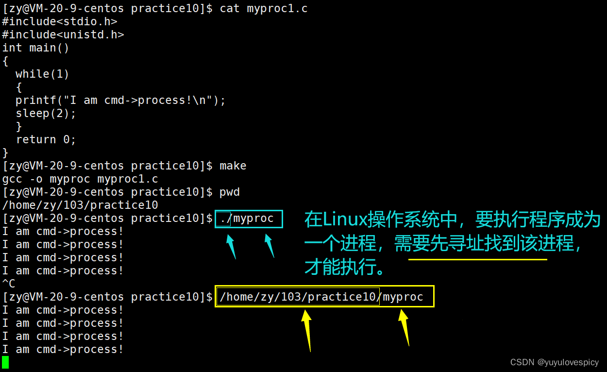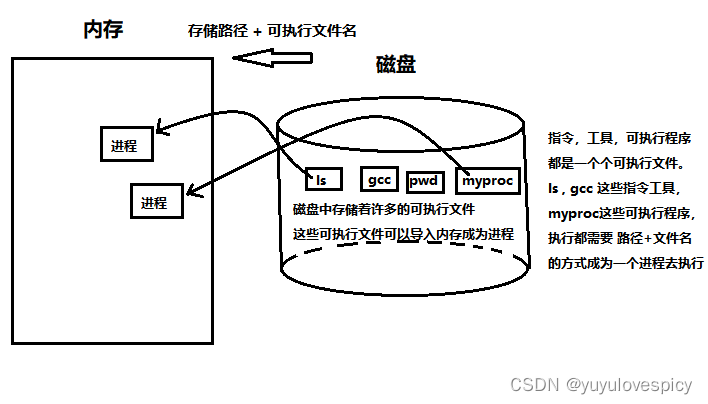 再明确一个概念,我们编译出的可执行程序(myproc),敲的指令(ls pwd),使用的工具(gcc g++),其实本质都是在硬盘中存储的.exe可执行文件,都是可以通过 路径+可执行文件名的方式 直接导入到内存中形成进程去执行。