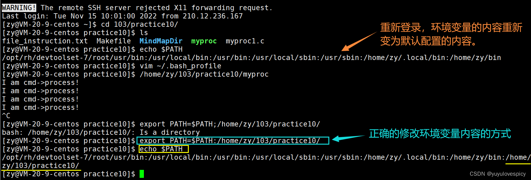export PATH=$PATH:/home/zy/103/practice10/ 如图修改环境变量PATH的内容成功。