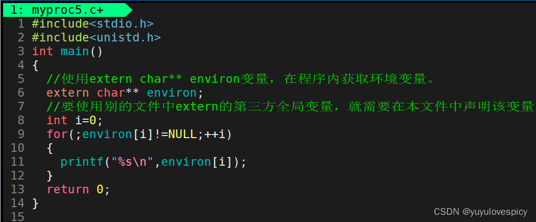 刚才我们是通过main函数参数在程序中获取该进程被传入的环境变量,当然我们还可以通过第三方变量environ来在程序中获取全局环境变量。