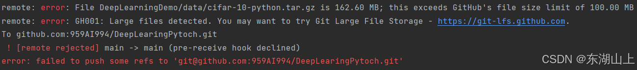 有时候会一不小心提交了大文件,发现会报如下的错误,这是因为github仅能满足100M以下的内容,太大了就不让上传了: