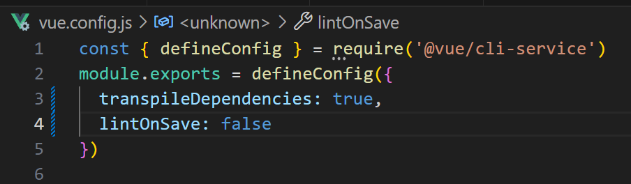 4.在vue.config.js里添加lintOnSave: false(用于关闭语法检测)