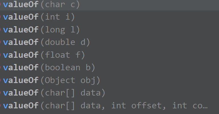 (1). String.valueOf('a'); 把int,char,double,boolean,char[] 等类型变成String类型,返回类型:String