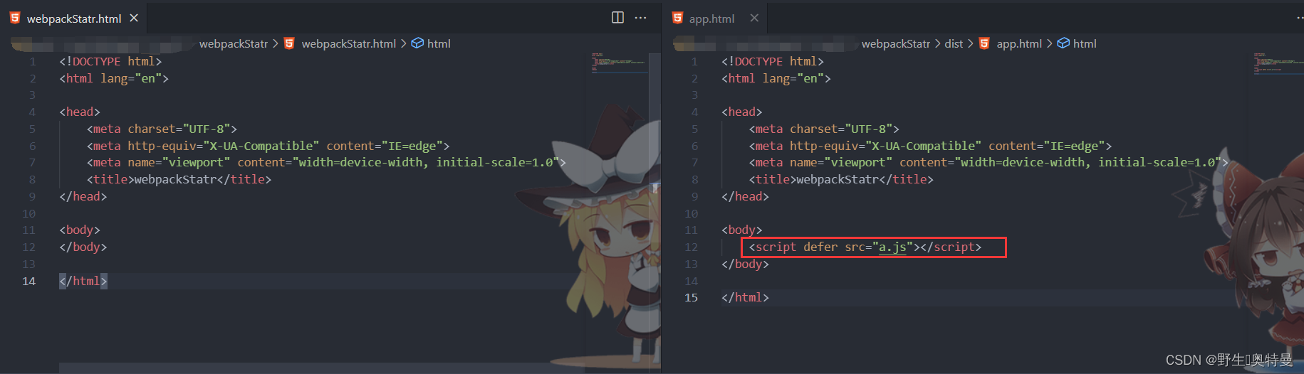 然后我们再比较一下生成的app.html和webpackStatr.html,以及生成的html中script标签的位置,我们可以看到两份文件是一样的,只不过打包后的多了一个script标签,位置是在body中,和我们之前设置的相吻合,如图: