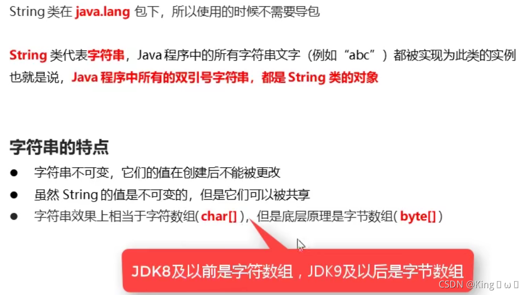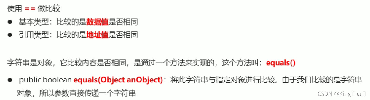 //string构造方法: //public String(),创建一个空白字符串对象,不含有任何内容; //public String(char[] chs),根据字符串数组的内容,来创建字符串对象。 //public Strinf(byte[] bys),根据字节数组内容,来创建字符串对象。 //String s=“abc”;直接赋值的方法创建字符串对象,内容就是abc; //推荐直接赋值的方法得到字符串对象 public class String_01 { public static void main(String[] args) { //public String(),创建一个空白字符串对象,不含有任何内容; String s1 = new String(); System.out.println("s1"+s1); //public String(char[] chs),根据字符串数组的内容,来创建字符串对象。 char[] chs={'a','b','c'}; String s2=new String(chs); System.out.println("s2"+s2); //public Strinf(byte[] bys),根据字节数组内容,来创建字符串对象。 byte[] bys={97,98,99}; String s3 = new String(bys); System.out.println("s3"+s3); //String s=“abc”;直接赋值的方法创建字符串对象,内容就是abc; String s4="abc"; System.out.println("s4"+s4); } } -