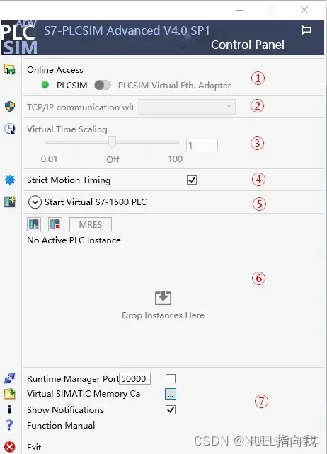 ①设置仿真实例的在线访问方式,有两种:“PLCSIM”使用本地总线访问CPU实例(仅能在同一台电脑内部使用),“PLCSIM Virtual Eth. Adapter”是通过虚拟网卡,以TCP/IP协议的方式访问CPU实例。使用后者必须在安装软件时勾选NPCap(4.0版本使用,早期使用WinPCap);