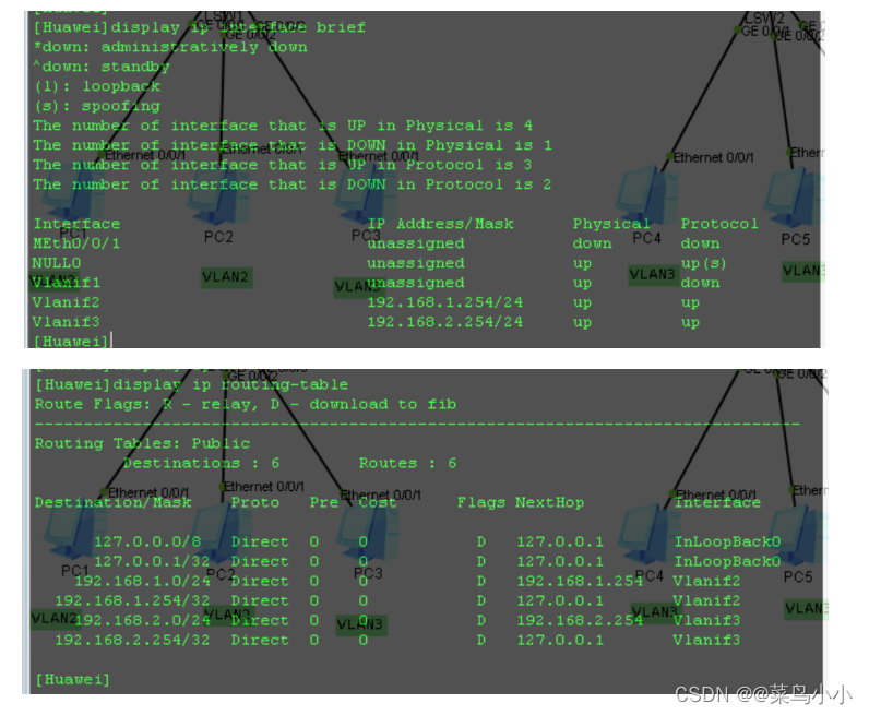[Huawei-GigabitEthernet0/0/5]port trunk allow-pass vlan 2 3 ---------设置trunk放通的VLAN流量
