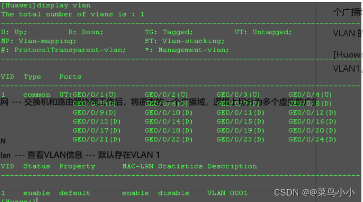 [Huawei]display vlan -------查看VLAN信息,默认存在VLAN1。