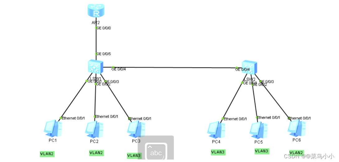 1.将LSW1上的接口G0/0/5做为Trunk,向外发送时带标签;