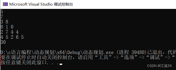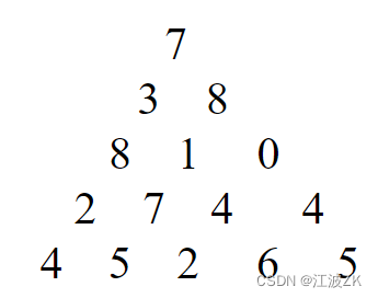 在上面的数字三角形中寻找一条从顶部到底边的路径,使得路径上所经过的数字之和最大。路径上的每一步都只能往左下或右下走。只需要求出这个最大和即可,不必给出具体路径。三角形的行数大于1小干等于100,数字为0-99。