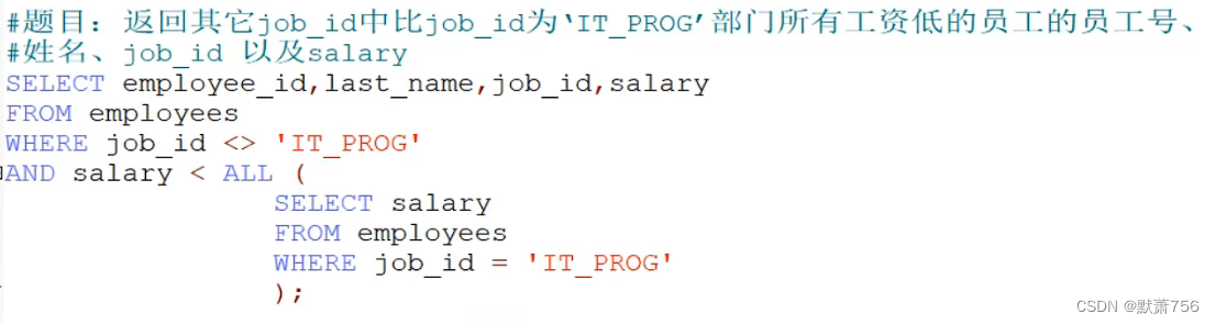 mysql> SELECT last_name,job_id,salary FROM employees WHERE salary=(SELECT MIN(salary) FROM employees);