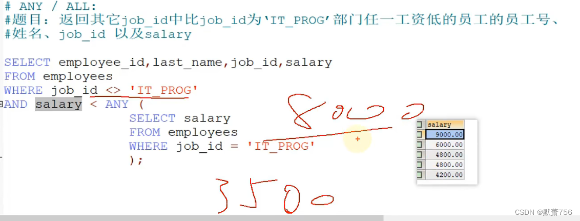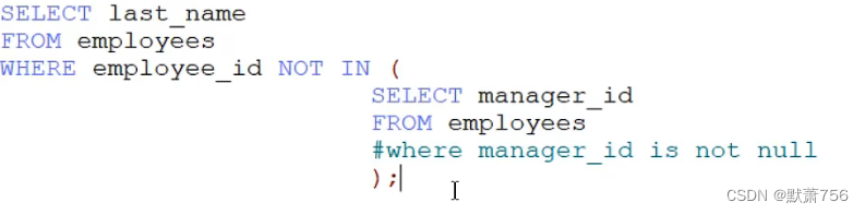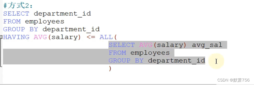 SELECT employee_id,last_name FROM employees WHERE salary=(SELECT MIN(salary) FROm employees GROUP BY department_id); //报错,返回值多余一行结果,不知道等于谁,应该使用多行子查询