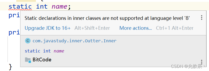 类比于成员方法,在成员方法中是不可以定义static的属性的,因为方法的调用需要对象来调用,而static的变量是不需要对象调用的,这显然是矛盾的